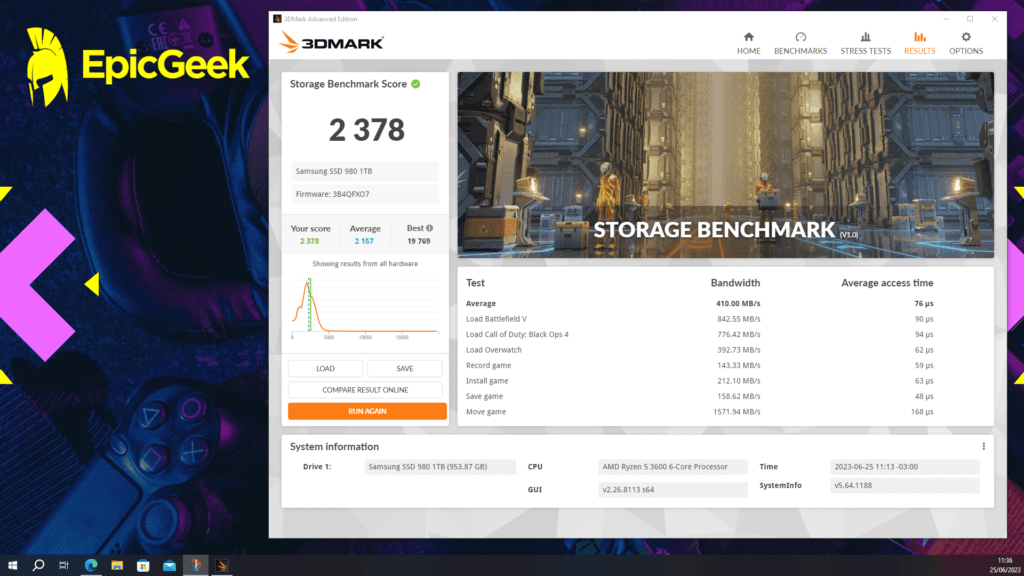No resumo da ópera, ele conseguiu 2.378 pontos com uma média de pouco mais de 410 MB/s na média em largura de banda, além de entregar mais de 842 MB/s no carregamento do Battlefield V e de 776 MB/s no Call of Duty: Black Ops 4.