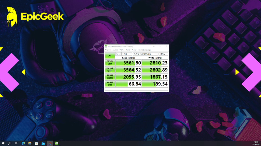 No teste padronizado, temos a efetiva confirmação de que o Samsung EVO 980 até passa um pouco do citado pela fabricante, sendo obtido 3561 MB/s na leitura e 2810 MB/s na escrita, ou seja, bem próximo dos 3500 MB/s e 3000 MB/s prometidos pela fabricante, no modelo com 1TB testado por aqui.