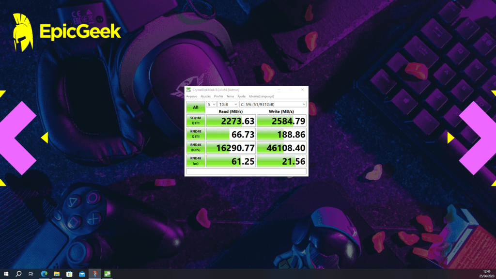 Como pode ser visto nos prints abaixo, o pico de velocidade foi de 2,54 GB/s para escrita e de 3,22 GB/s na leitura, ou seja, abaixo do citado pela marca como limite mas ainda assim, bons resultados no geral.