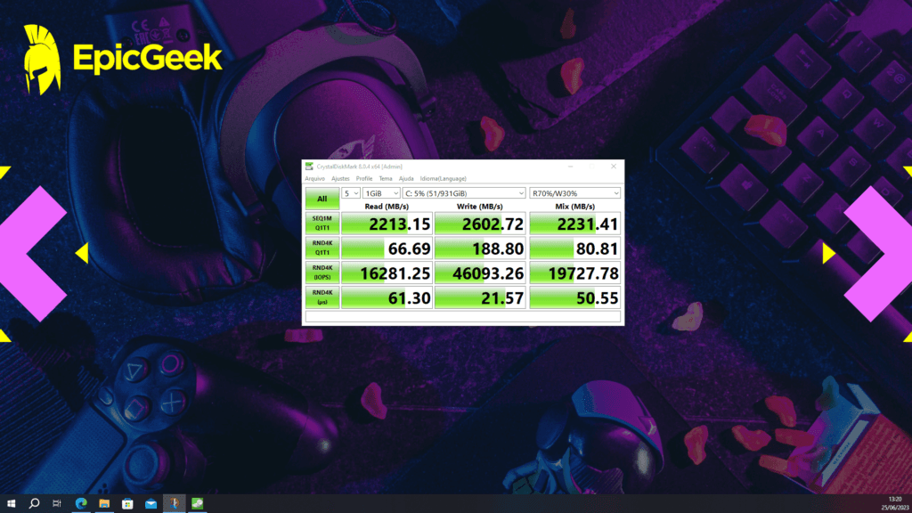 Considerado um dos mais conhecidos aplicativos de benchmark para HDs e SSDs, o CrystalDisk Mark nos permite confirmar se os valores prometidos de velocidade batem com o que é realmente entregue, bem como flutuações de cenário.