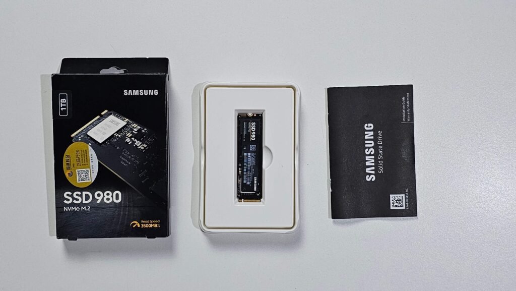 Tal qual temos em outras marcas, o Samsung EVO 980 não foge do padrão e é entregue em uma pequena caixa que preta com uma ilustração do SSD e informações relacionadas ao modelo, capacidade e desempenho.
