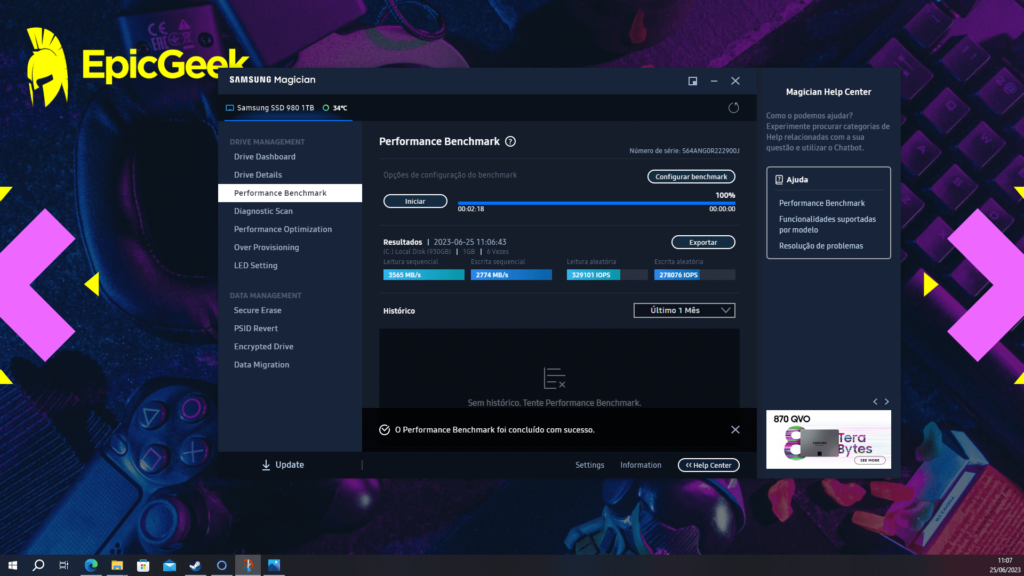 Como o Samsung Magician tem também seu espaço de benchmark, aproveitei para executar os testes oficiais e no geral, temos resultados bem próximos dos vistos no CrystalDisk Mark.