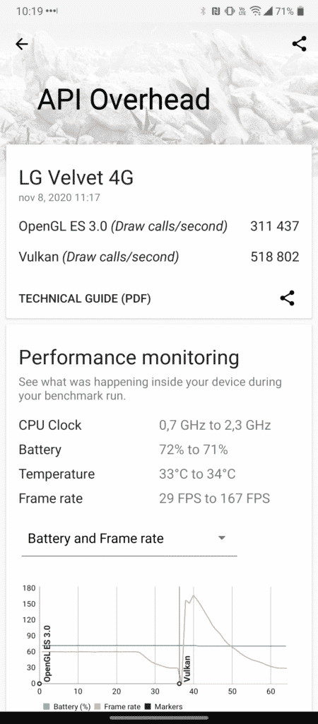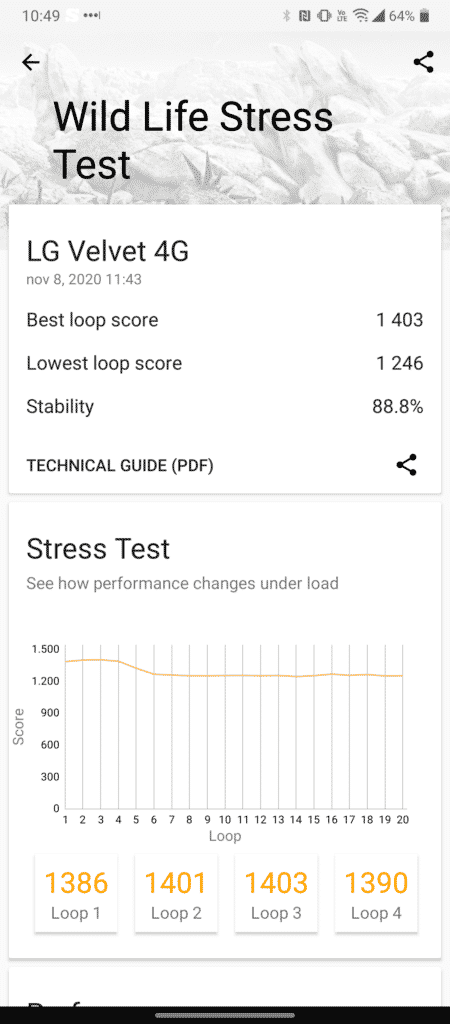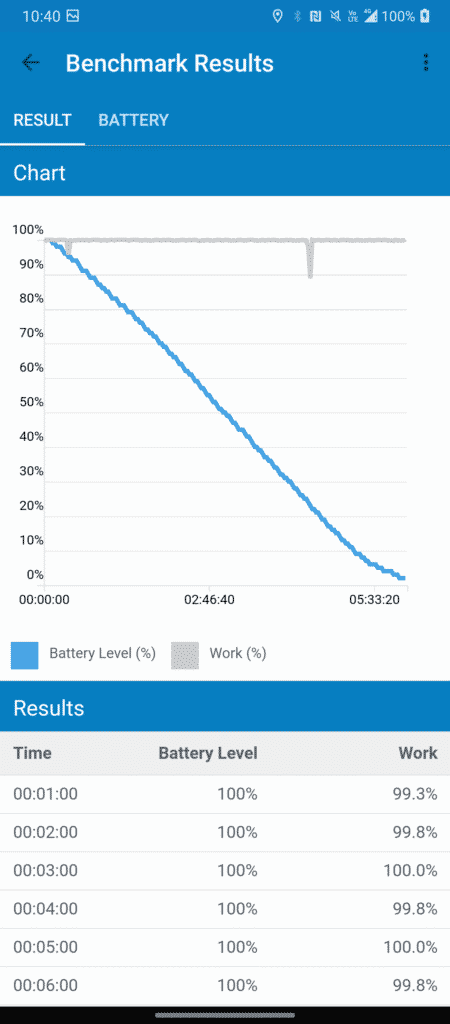 Para se ter uma noção do tempo possível de se obter com o LG Velvet, rodamos o já tradicional Geekbench 4.4.2 Pro no modo teste de bateria, utilizando o brilho no máximo e o resultado final apontou para uma autonomia de pouco mais de 6h, como pode ser conferido abaixo.