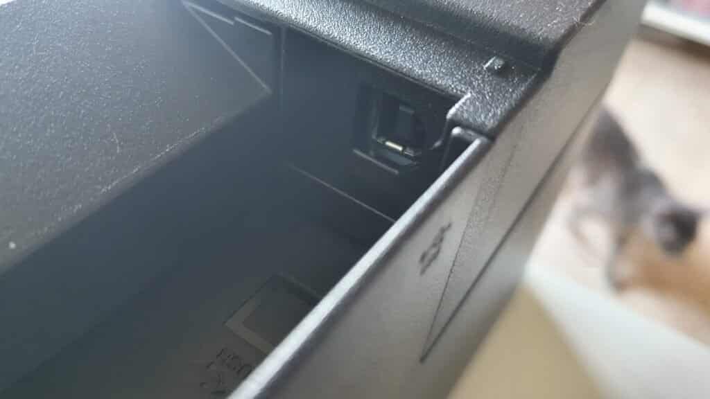 Parte óbvia em uma multifuncional, o mais coerente que se espera é a oferta de um reservatório de folhas de acesso fácil e isso não acontece nela. Para você colocar novas folhas, existe a necessidade de remoção de todo o bloco que integra a gaveta, a cobertura e também, a lingueta para que as folhas não caiam no chão.