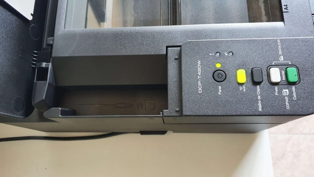 Nesse sentido, temos que a DCP-T420W pode ser conectada através da porta USB disposta dentro do equipamento ou via Wi-Fi, o que favorece em especial o uso em mais de um dispositivo e também, a feliz observação de que você terá menos um cabo pela casa pegando poeira.