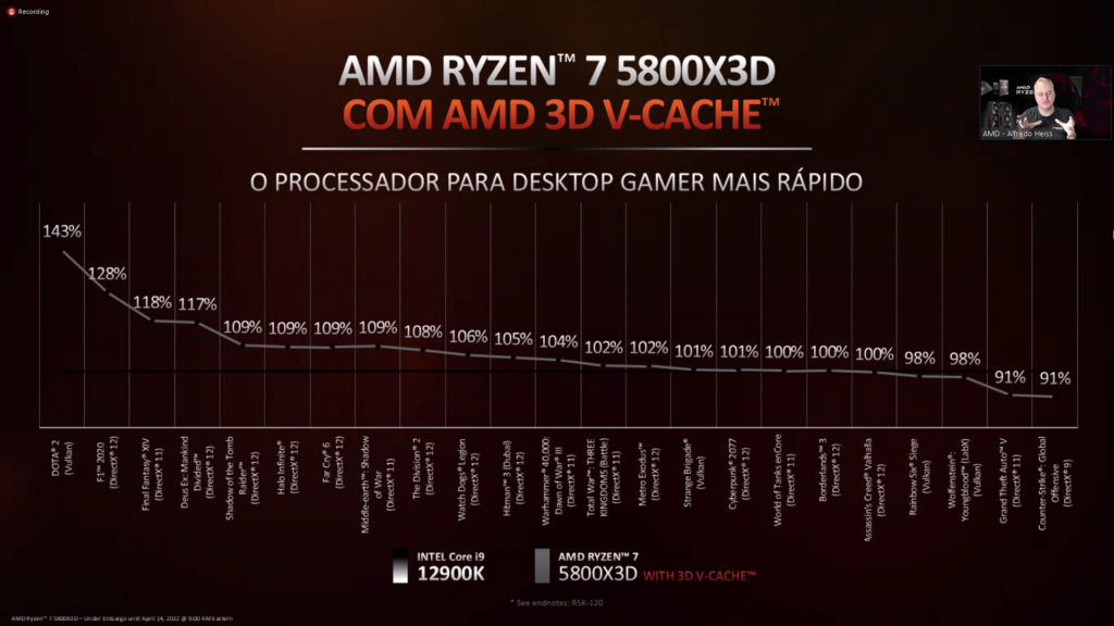Outro ponto de destaque foi a citação do Ryzen 7 5800X3D, processador que, como o próprio nome diz, é o primeiro gaming a utilizar tecnologia 3D V-Cache, mostrando que ainda é possível dar uma sobrevida longa ao AM4 utilizando soluções novas.