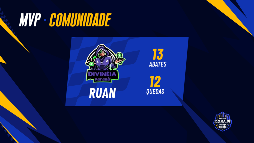 Já o MVP de Comunidade foi o Ruan, da equipe Divinéia, que garantiu o título com 13 abates em 12 quedas.