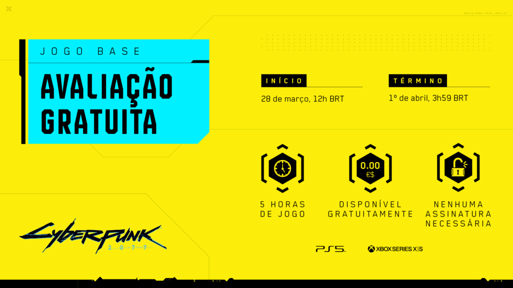 A avaliação gratuita de Cyberpunk 2077 estará disponível a partir das 12h (meio-dia) da quinta-feira, 28 de março, até às 3h59 de segunda-feira, 1º de abril (horários de Brasília). Oferecendo cinco horas de jogo irrestrito, os proprietários de PlayStation 5 e Xbox Series X|S poderão jogar o teste sem quaisquer taxas ou assinaturas adicionais necessárias.