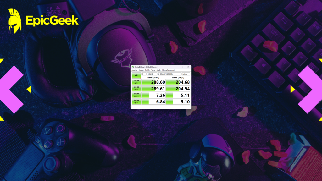 Vale lembrar que as velocidades prometidas no blister do produto é de 280 MB/s e 180 MB/s respectivamente para leitura e escrita, ou seja, ambas as estimativas foram superadas com facilidade.