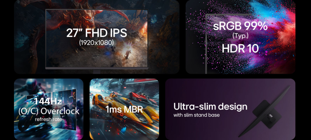 Os novos modelos da linha UltraGear são equipados com painéis de resolução Full HD (1920×1080) e tecnologia IPS. A escolha do painel visa equilibrar a fidelidade de cores, com cobertura de 99% do espaço sRGB, e amplos ângulos de visão. Os monitores contam ainda com suporte ao padrão HDR10, que permite um maior alcance dinâmico de brilho e contraste em conteúdos compatíveis, reproduzindo imagens mais próximas da intenção original dos desenvolvedores.