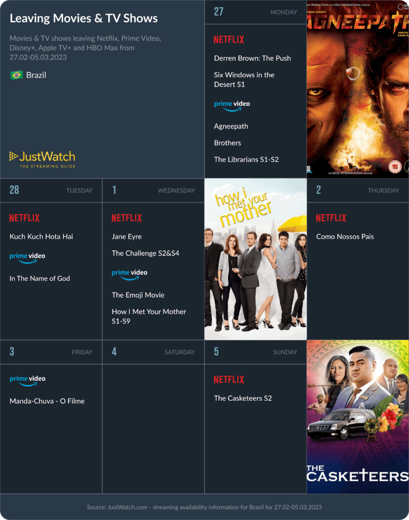 Já no Prime Video, a faxina já começa com a exclusão de “Agneepath”, “Brothers” e “The Librarians” com as duas primeiras temporadas saindo no dia 27 e fechando fevereiro, temos a remoção de “Em nome de Deus” em 28/02. Já em março, são confirmadas a saída de “Emoji: O Filme” e “How I Met Your Mother” com 9 temporadas retiradas de uma vez em 01/03 e por fim, em 03/03 temos a baixa com “Manda-Chuva – O Filme”.