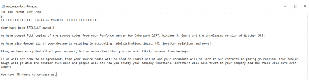 Outra informação publicada pela CD PROJEKT RED foi o “read_me_unlock”, arquivo deixado pelo responsável pela invasão que revela um pouco mais sobre o que pode ter sido vazado e quais são as exigências e ameaças do hacker.