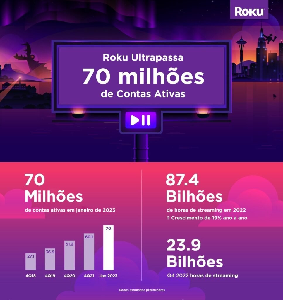 A Roku confirmou oficialmente ontem (05) a superação de mais um marco histórico: a de 70 milhões de contas ativas praticamente um ano após os 60,1 milhões, registrados no último trimestre de 2021.