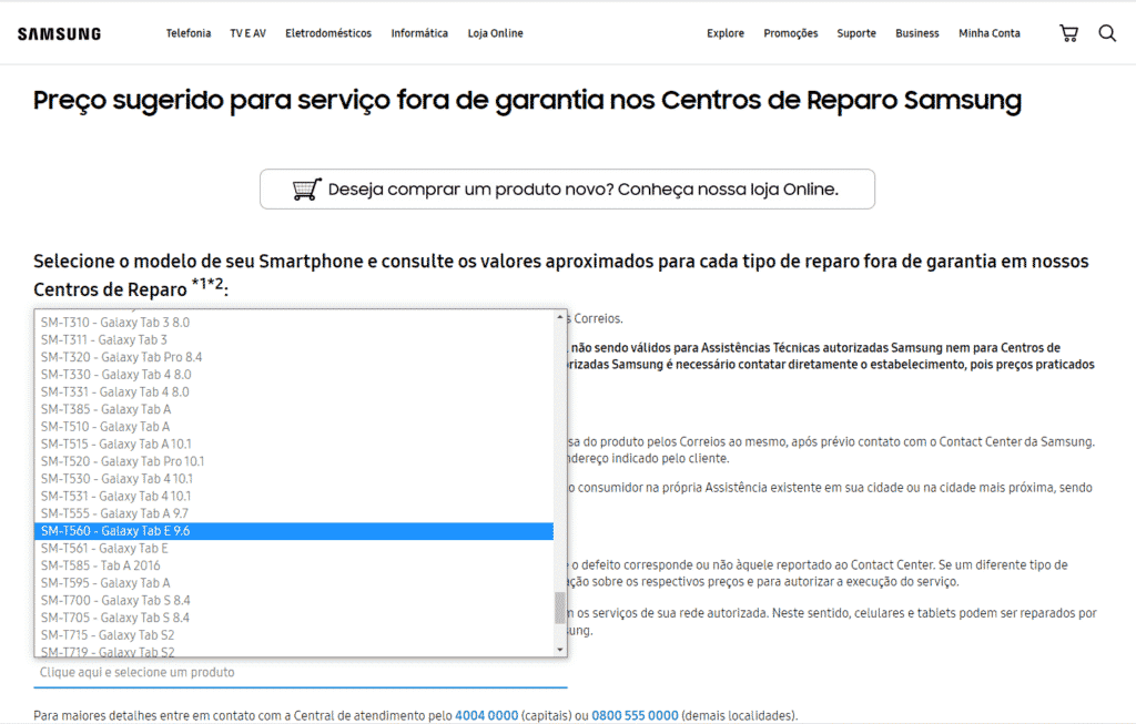 Com o nome de “Preço sugerido para serviço fora de garantia nos Centros de Reparo Samsung“, a página em questão consiste basicamente em um filtro que permite a seleção de smartphones, tablets e wearables, como pode ser visto abaixo.
