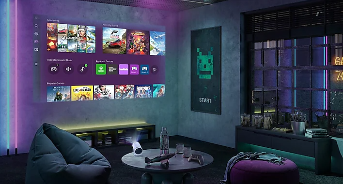 Não menos importante, ele também é compatível com bateria externa portátil para consumo de conteúdo sem a necessidade de tomadas, som em 360º, suporte a assistentes de voz para controle do dispositivo e capacidade de projeção Full HD de 30 a 100 polegadas.
