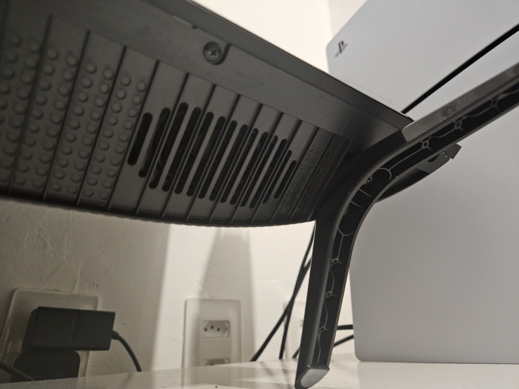 Atrás, encontramos um bloco mais elevado na parte inferior que ocupa mais espaço no centro para abrigar a furação VESA 100×100, painel de conexões na lateral esquerda e entrada para cabo de energia na lateral direita (sendo esses posicionamentos considerando que você está olhando para a traseira da TV).