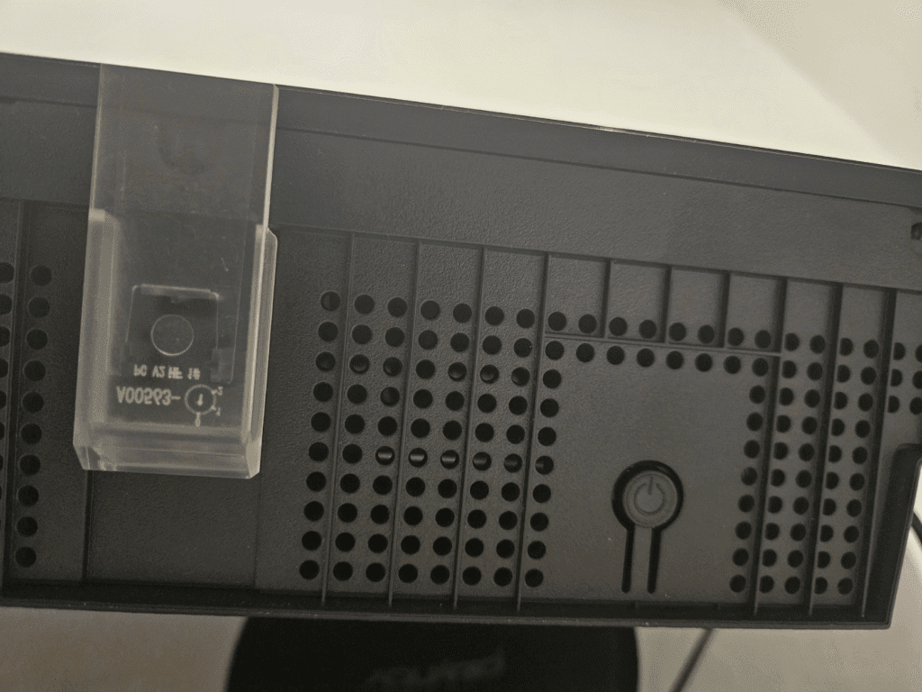 Ainda falando da parte inferior da SEMP ROKU R6610, temos nela a disponibilização das duas caixas de som que ficam posicionadas ao lado dos pés e, curiosamente, um botão de liga/desliga que fica alinhado 6cm à direita do retângulo de notificações.