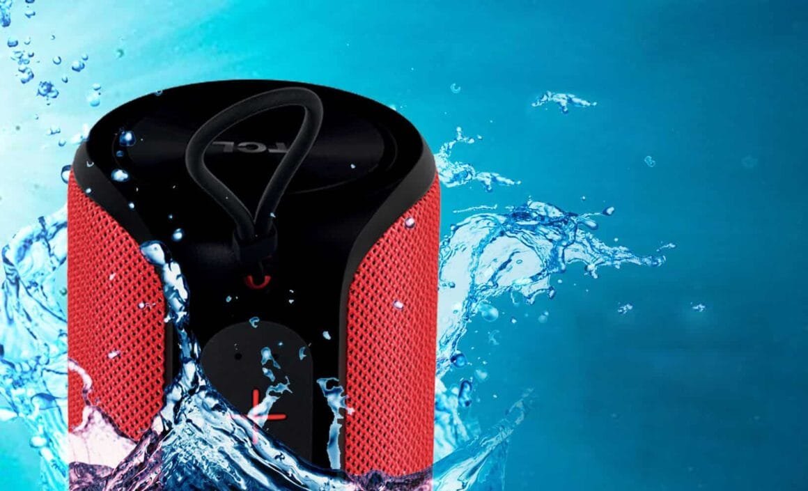 No quesito acabamento, a caixa de som bluetooth TCL BS12A é feita em tecido vermelho e borracha, havendo a promessa de que esta seja resistente e durável.