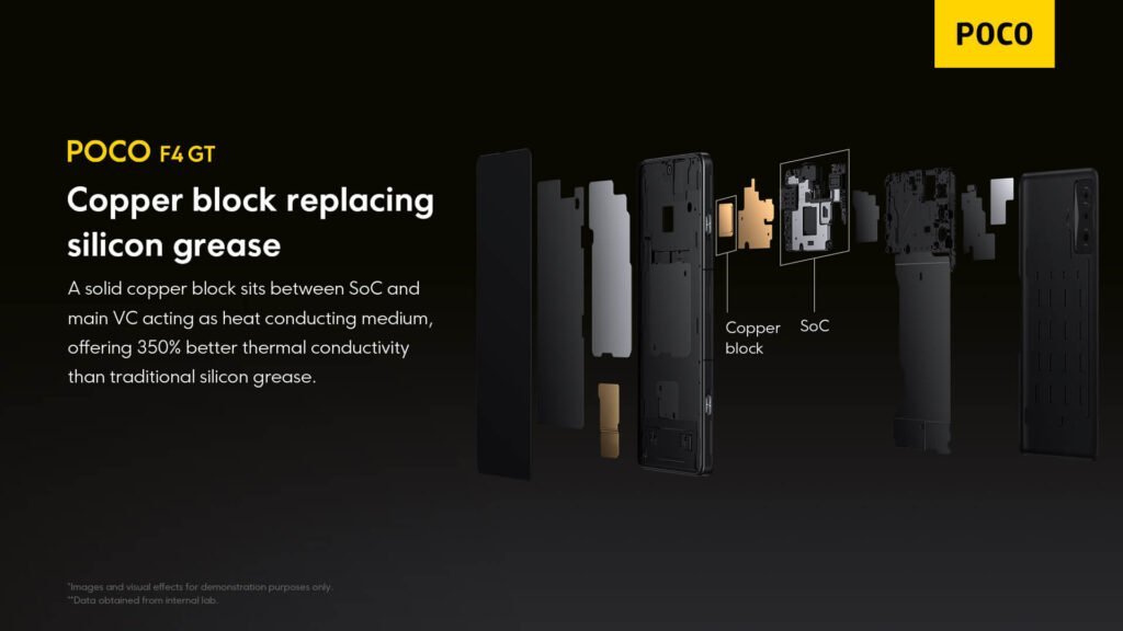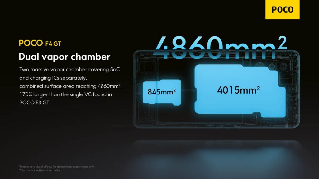 Outro detalhe visto no POCO F4 GT é o aumento na “câmara de vapor” que ocupa duas áreas num total de 4860 mm², sendo 170% superior quando comparado com o POCO F3 GT, que tinha apenas uma área dessas.