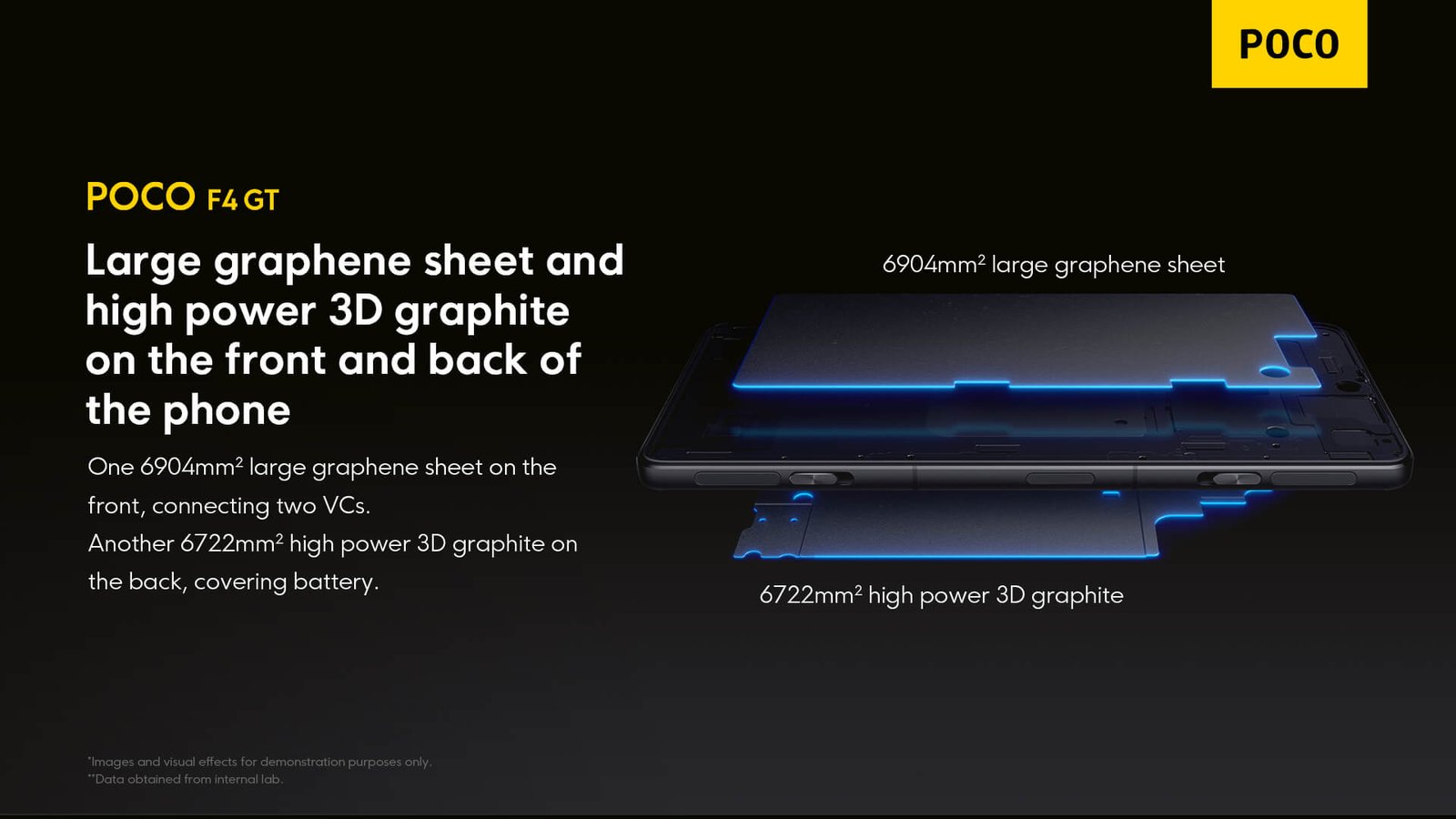 Não menos importante, é também esperada a utilização de grafeno no POCO F4 GT, sendo visto tanto na proteção das antenas e duas folhas dedicadas a ocupar a parte frontal e traseira do aparelho, ocupando uma área total de 6904 mm² e 6722 mm², respectivamente.